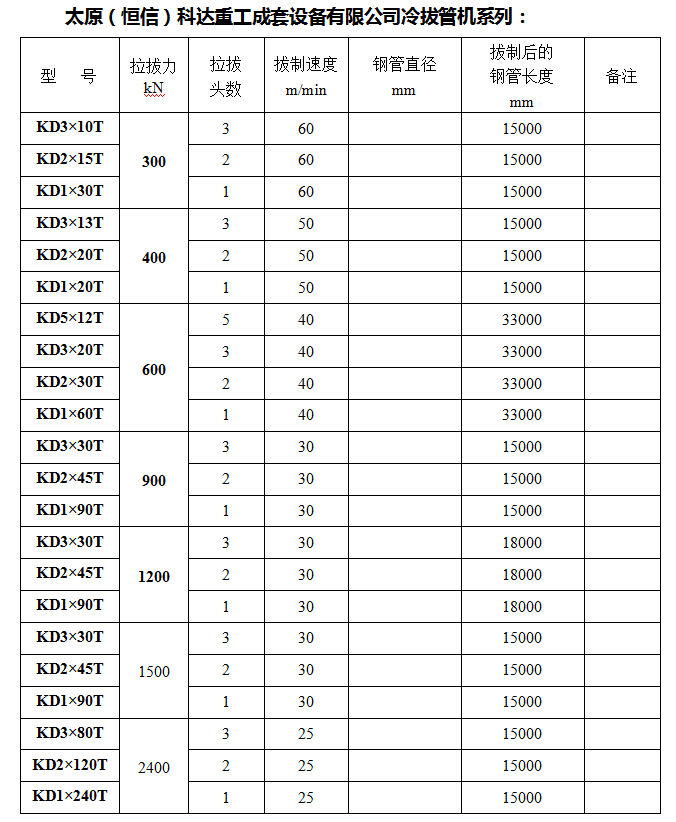 冷拔機設備能力概述(按噸位選型時上下限不同)